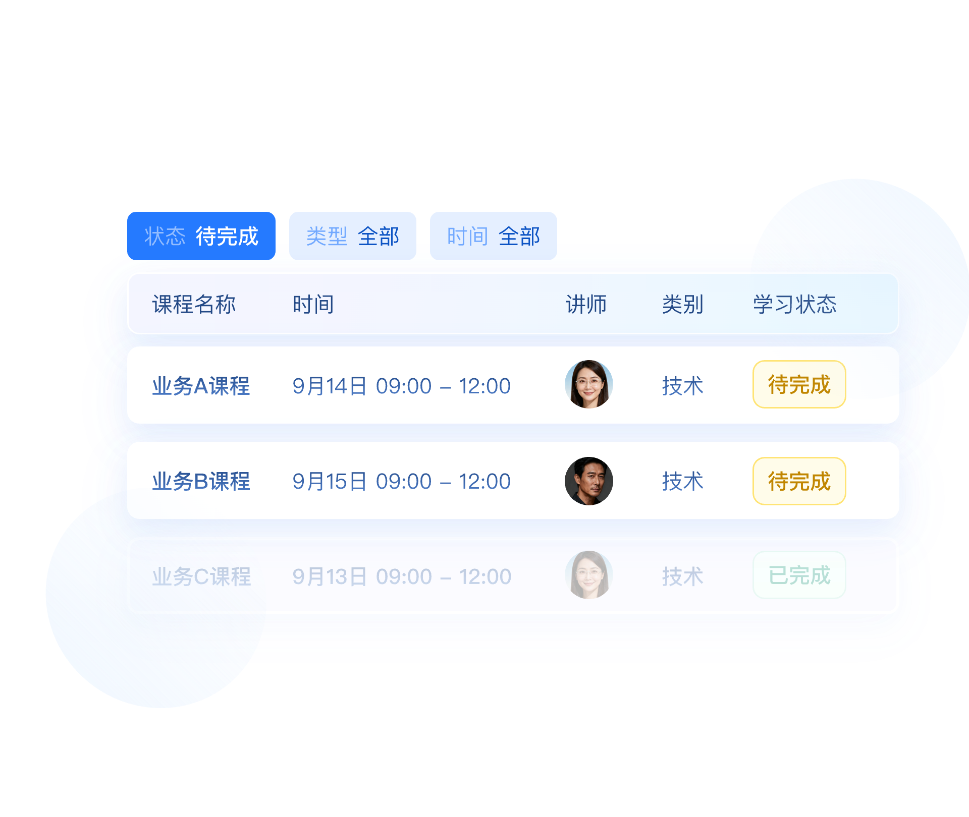 学员查看个人课程列表,展示名称、时间、讲师、类别及学习状态(未完成/已完成)