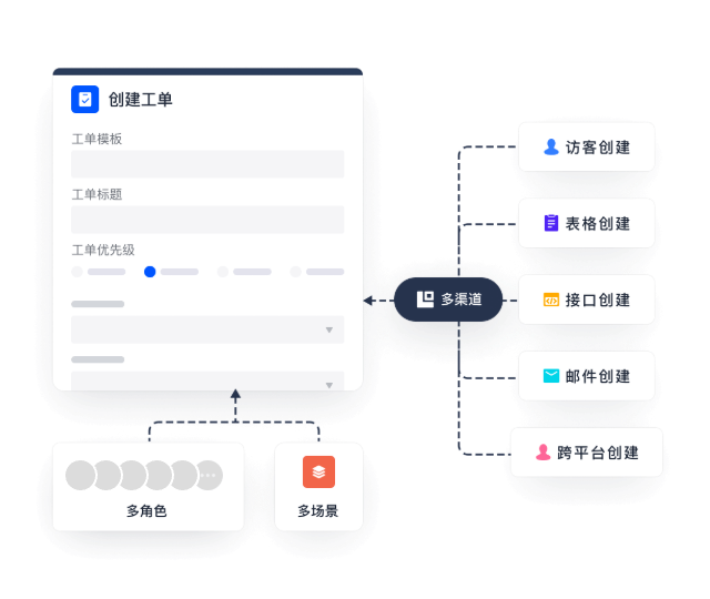 支持多种工单创建方式,访客创建、表格创建、邮件创建、跨平台创建、接口创建等
